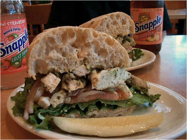 Pesto chicken & havarti cheese sandwich on ciabatta bread, mmm