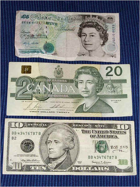5 british pounds, 20 canadian dollars, and 10 us dollars