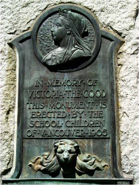 Monument for Queen Victoria; "In memory of Victoria the Good; This monument is erected by the school children of Vancouver 1905"